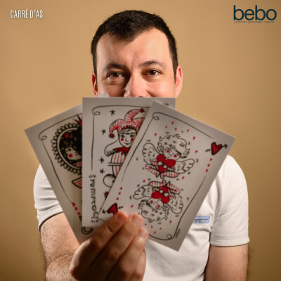 On transmettra pour le lieu, on est au Play Hotel dans le 8ème arrondissement à Paris, un joli endroit, on a bu un petit café juste avant, c'était sympa aussi. Donc le concept de Caridas, on va le démarrer tout de suite avec des cartes que je vais mettre devant toi. Tu auras des questions derrière, tu devras y répondre comme avec la première que tu as fait juste avant. Des fois t'auras le choix, des fois t'auras pas le choix, t'auras une seule carte et on va démarrer du coup avec les deux premières cartes. C'est le roi bleu et le roi rouge.